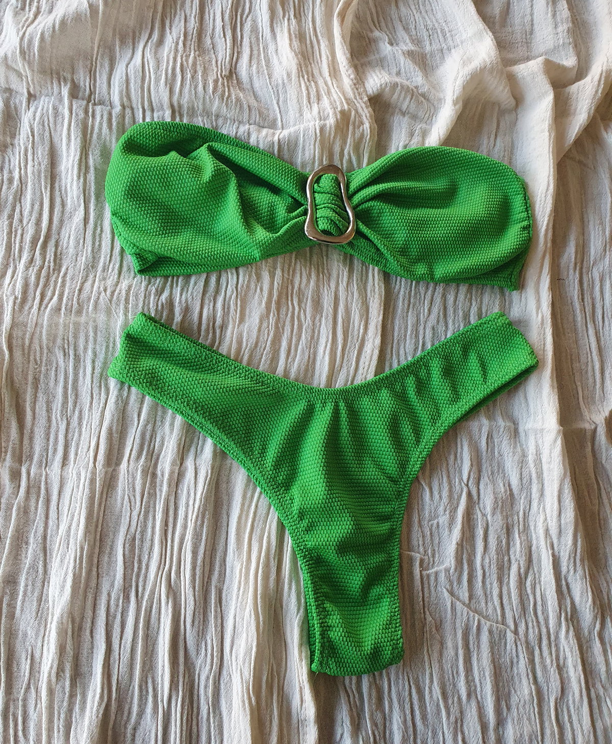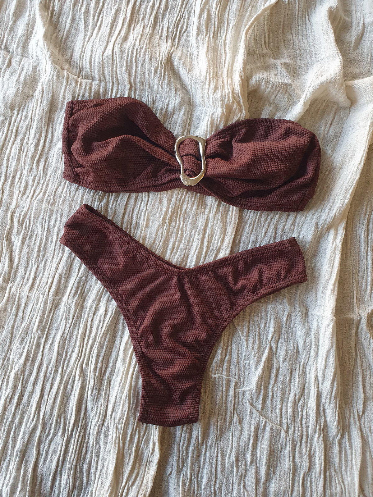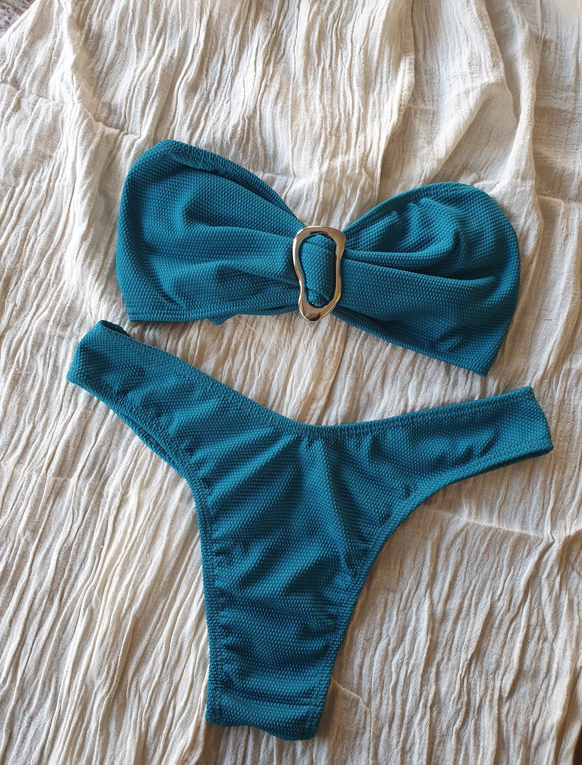 Un diseño elegante y moderno, con un toque sofisticado que lo hace único. Top estilo strapless con hebilla metálica central y bombacha colales en V que estiliza la figura, se ata en espalda. Su tela texturada lo convierte en un must de la temporada: cómodo, canchero y perfecto para destacar en la playa o la pile.